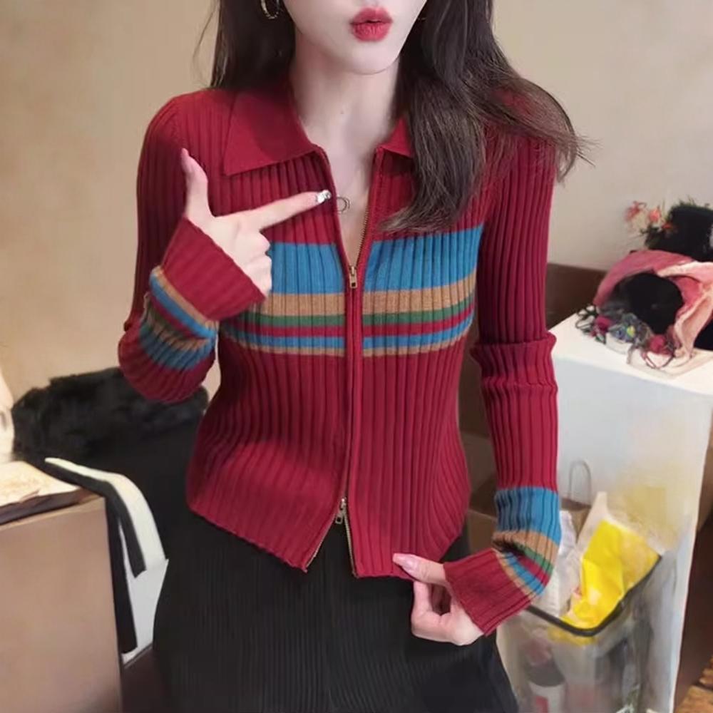 正紅條紋撞色親膚針織款拉鏈衫 顯白神器 彈性透氣不黏身 修身顯比例 甜酷感滿分 搭裙搭褲都好看